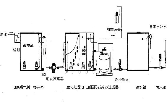 洗浴廢水的主要污染物為表面活性劑,有機物及灰塵等雜質。處理這種廢水有生化法、物化法、膜生物反應器法、超濾法等處理工藝,均能達到回用標準。當水量不太大時,用物化法比較好,且操作容易,運行穩(wěn)定,不受水質水量變化的影響;生化法可在水質水量均較穩(wěn)定的場合應用,在北京市應用最廣,生化法中水水量回收率可達90%以上,膜生物反應器(MBR)法出水水質最好,但投資較高,超濾工藝出水水質較好、首次投低,但后續(xù)更換膜組件費用較高。