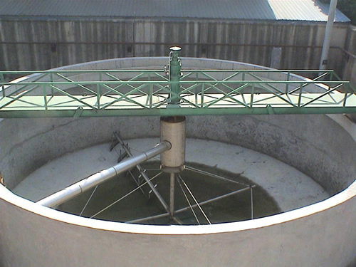 周邊傳動(dòng)刮泥機(jī)還可以用于輻流式污泥濃縮池中,這時(shí)在工作橋下安裝豎向柵條,可提高污泥濃縮效果。