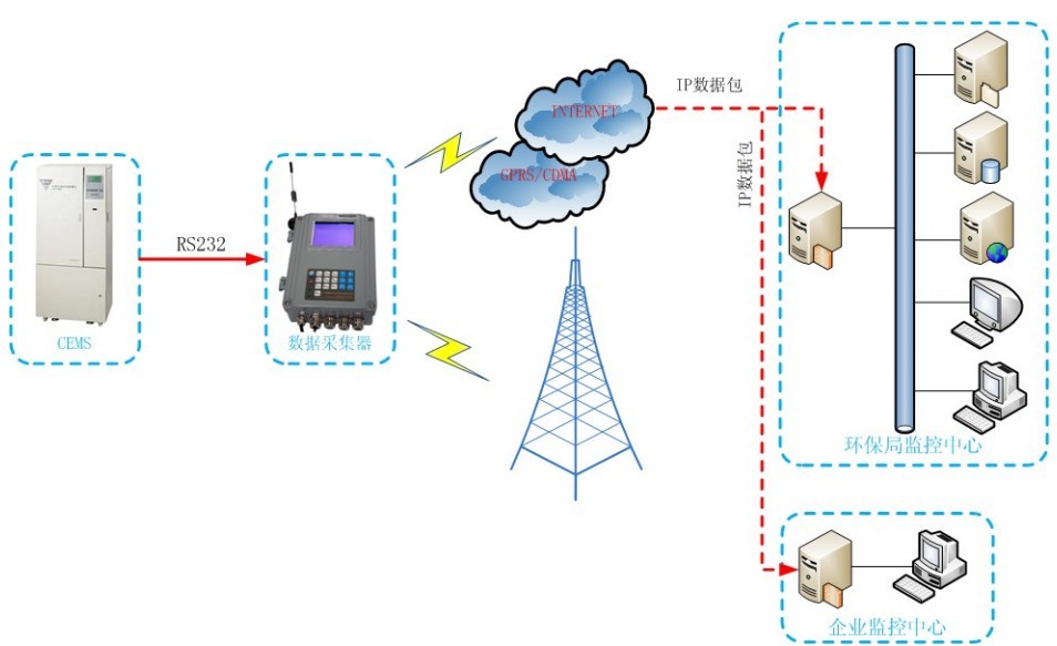 一個完整的污染源在線監(jiān)控系統(tǒng)由二部分組成,其一是運(yùn)行在環(huán)保部門的軟件監(jiān)測平臺,這個平臺接收現(xiàn)場數(shù)據(jù),能保存和顯示各企業(yè)的實(shí)時排放數(shù)據(jù),有超標(biāo)報警、統(tǒng)計(jì)和報表等基本功能。其二是安裝在各企業(yè)排污口的相關(guān)監(jiān)測儀器和采集通信設(shè)備,這些儀器設(shè)備自動測量采集污染物數(shù)據(jù),并將數(shù)據(jù)上報到污染源在線監(jiān)測平臺。