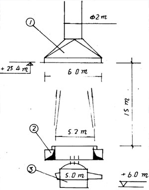 ②在電爐正上方屋頂下檐設(shè)一屋頂排煙罩。煙塵經(jīng)屋頂捕集后輸送至布袋除塵器,經(jīng)風(fēng)機(jī)、排氣筒排至大氣。屋頂排煙罩設(shè)方形或圓形,尺寸6×6m(φ6m),排氣速度1.2m/s(1.5m/s)?稍O(shè)法蘭邊,罩的收縮角不大于60。