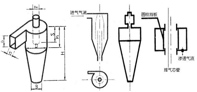 旋風(fēng)除塵器中用的最多的是切向進口形成的旋風(fēng)除塵器(如圖1),這種旋風(fēng)除塵器通?梢杂靡酝搀w直徑D為比值的結(jié)構(gòu)參數(shù)(無因次結(jié)構(gòu)參數(shù))來設(shè)計。由于 Stairmand型(高效型)研究數(shù)據(jù)比較完整和應(yīng)用中的有效性,許多研究者把自己改進旋風(fēng)除塵器與其作性能對比。