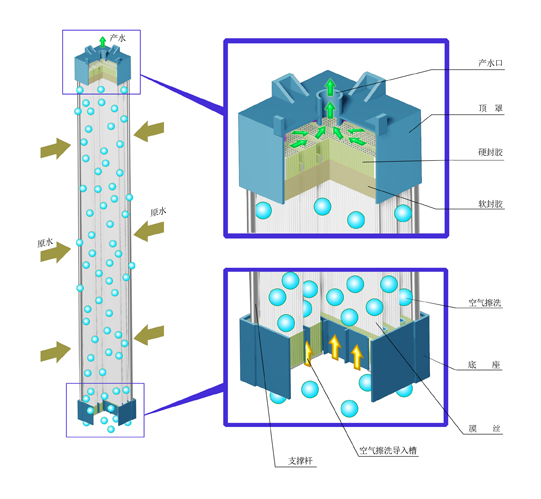 塞偉爾MBR超濾膜組件由多根PVDF超濾膜毛細(xì)管結(jié)合而成。使用時(shí)膜組件被浸沒(méi)在原水池中;水分子在池水水頭壓力作用下或在產(chǎn)水泵抽提下由外向內(nèi)透過(guò)毛細(xì)管膜,毛細(xì)管膜內(nèi)的純化水經(jīng)純化水集水管匯聚成純化水流;污染物和活性污泥被截留在毛細(xì)管膜外部的原水池內(nèi)。毛細(xì)管膜的外壁可以通過(guò)池內(nèi)曝氣、水流反洗或化學(xué)清洗等程序得到清洗。