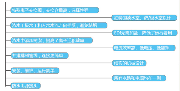 由于膜表面極化等問題,當給水硬度超過百萬分之一時,傳統(tǒng)EDI組件面臨嚴重的結(jié)垢問題。這一問題及大地影響了EDI技術(shù)的廣泛應(yīng)用?财諣朣-EDI技術(shù)在組件結(jié)構(gòu)上的革新,使EDI給水硬度得以提高十倍,同時將耗電量降低75%以上。之一技術(shù)進步為EDI技術(shù)的更廣泛應(yīng)用提供了技術(shù)基礎(chǔ)。在以下多方面表現(xiàn)出優(yōu)勢。
