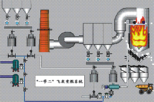 將燃煤鍋爐電除塵器收集的干灰,利用專用輸送裝置、以特定的方式重新送回鍋爐爐膛的高溫區(qū),一方面使飛灰中的殘余可燃物二次燃燒,另一方面使飛灰在爐膛中變?yōu)榱鲃?dòng)性高溫爐渣(溫度1200~1400℃),再由鍋爐排渣口流出,經(jīng)水淬炸裂為2~10mm的固態(tài)玻璃體水淬渣。