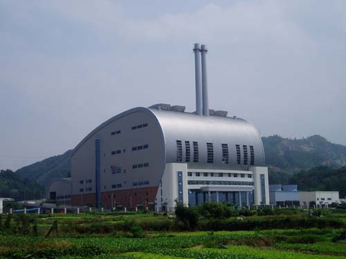 該電廠采用緊湊型的建筑模式,其垃圾接收儲存、高溫焚燒及熱能回收、汽輪發(fā)電機(jī)組發(fā)電、煙氣處理、污水處理、配套輔助生產(chǎn)設(shè)施和必要生活設(shè)施等均處于同一主廠房內(nèi),極大地節(jié)約了土地資源。該電廠于2002年12月舉行奠基典禮,至2005年10月投產(chǎn),工期僅為34個(gè)月。