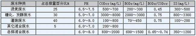 目前我國(guó)啤酒生產(chǎn)廢水主要來(lái)自麥芽車(chē)間。有浸麥廢水;糖化工段的糖化、過(guò)濾和洗滌廢水,發(fā)酵工段的發(fā)酵廢液和洗槽廢水,灌裝車(chē)間的洗瓶水、滅菌用水及瓶破碎時(shí)渣出的少量啤酒,其它廢水包括冷卻水,地面沖洗水等。各股廢水的污染物濃度詳見(jiàn)表1。