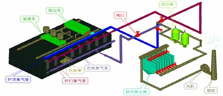 (2)在爐頂設(shè)煙塵收集車與裝煤車配合工作,利用地面站所設(shè)風(fēng)機(jī)所產(chǎn)生的吸力,將裝煤、出焦產(chǎn)生的污染氣體吸集后,通過燃燒、消解苯并芘(Bap)并冷卻后,通過輸送總管進(jìn)入空冷器,空冷至100℃后進(jìn)入干式除塵機(jī)組,除塵后經(jīng)風(fēng)機(jī)通過煙囪排入大氣。 本系統(tǒng)達(dá)標(biāo)穩(wěn)定,適應(yīng)于4.3米以上的焦?fàn)t,對焦?fàn)t所要求的有組織排放和焦?fàn)t無組織排放的各項(xiàng)指標(biāo)均低于國家環(huán)保二級標(biāo)準(zhǔn)的限值。