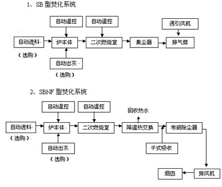 SBNF型焚化系統(tǒng)主要增加設(shè)備:降溫?zé)峤粨Q裝置、干式除酸及二惡英吸收裝置、布袋除塵裝置、排風(fēng)機(jī)、煙囪。