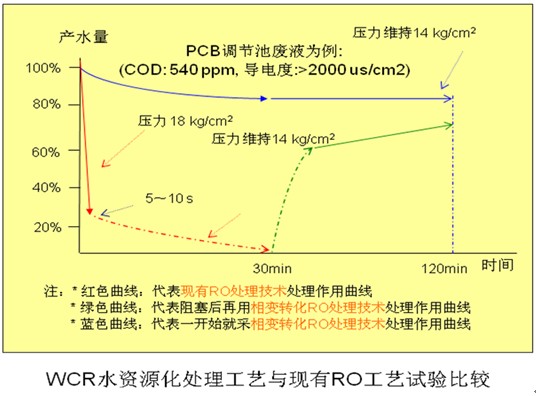 由于傳統(tǒng)的膜工藝對COD/BOD不能有效的去除,致使UF\RO易污染、阻塞、產(chǎn)水量大幅下降,不易恢復(fù)。必須對膜進行頻繁的清洗和化學(xué)清洗,由此產(chǎn)生二次污染。且產(chǎn)生的濃水污泥的毒性也不能徹底解決,沒有達到真正的零排放,零污染。膜的污染使水的過濾阻力增大,產(chǎn)量下降,能耗升高,設(shè)備投資加大。而WCR水處理系統(tǒng)有效的解決了在這些問題。