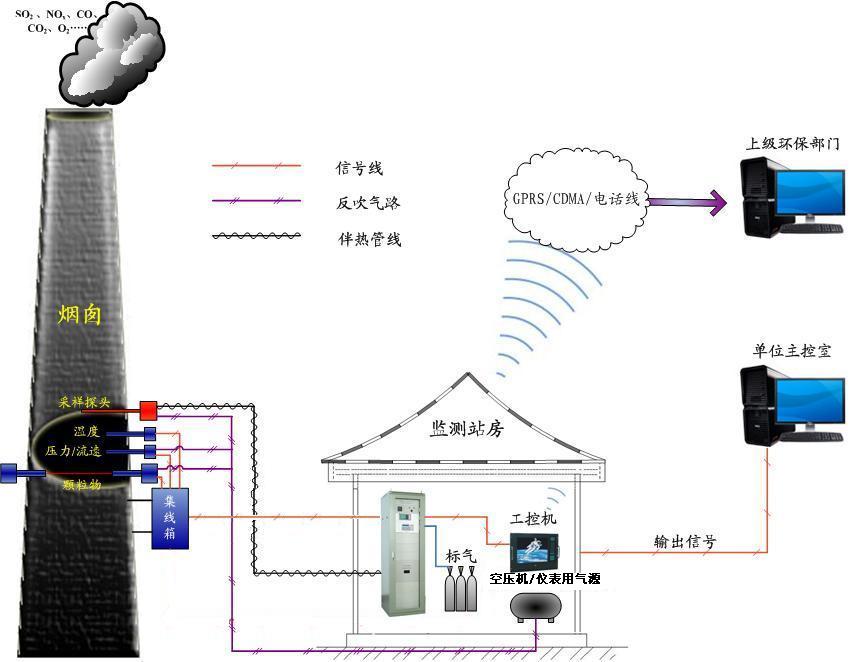 煙氣排放連續(xù)監(jiān)測(cè)系統(tǒng)適用于各種鍋爐連續(xù)廢氣排放量的監(jiān)測(cè),采用直接抽取法,可以連續(xù)在線監(jiān)測(cè)顆粒物的濃度、二氧化硫(SO2)濃度、氮氧化合物(NOX)濃度、氧氣(O2)含量、煙氣溫度、煙氣壓力、煙氣流速,還可以增加一氧化碳(CO)、二氧化碳(CO2)、氯化氫(HCL)、氟化氫(HF)、氨氣(NH3)、碳?xì)浠衔?CHX)、濕度等參數(shù)的測(cè)量。其控制計(jì)算機(jī)可以將所測(cè)到的數(shù)據(jù)進(jìn)行處理和存貯;可通過(guò)網(wǎng)絡(luò)與上級(jí)環(huán)保部門(mén)的計(jì)算機(jī)連接,環(huán)保部門(mén)可以方便、快捷地調(diào)用監(jiān)測(cè)數(shù)據(jù)。企業(yè)內(nèi)部可以通過(guò)局域網(wǎng),根據(jù)訪問(wèn)權(quán)限對(duì)數(shù)據(jù)庫(kù)進(jìn)行操作,如讀取數(shù)據(jù)、修改狀態(tài)參數(shù),甚至對(duì)系統(tǒng)進(jìn)行直接操作。由于采用直接抽取法測(cè)量煙氣中的污染物濃度,系統(tǒng)可以用標(biāo)準(zhǔn)氣對(duì)分析儀進(jìn)行在線標(biāo)定,保證監(jiān)測(cè)數(shù)據(jù)的準(zhǔn)確性。氣體分析采用的是非分散紅外吸收法;含氧量的監(jiān)測(cè)采用壽命可達(dá)十年的順磁氧分析儀器。