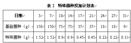 ⑵當(dāng)污泥濃度達(dá)到要求以后,開始向膜池中投加基礎(chǔ)菌種和特殊菌種,投放日期和投放量按下表執(zhí)行:
