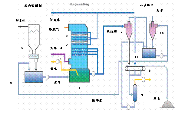 1、吸收劑槽 2、吸收帶 3、除霧器 4、氧化鼓風(fēng)機(jī) 5、吸附劑倉 6、新配制的洗滌懸吊槽 7、石膏漿旋流器站 8、真空皮帶過濾器 9、真空泵 10、廢水旋流器站 11、循環(huán)水槽