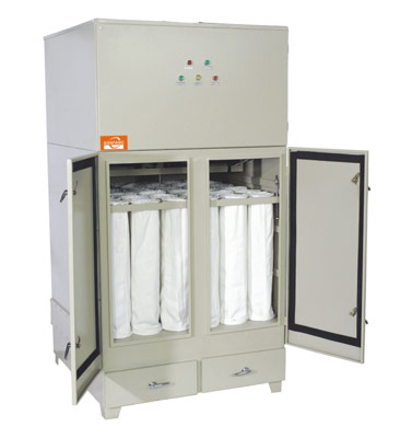 將機(jī)組放置獨(dú)立的除塵間,配置相應(yīng)的風(fēng)管及吸塵罩與除塵器連接,插上電源,開(kāi)啟風(fēng)機(jī)鍵,含塵空氣從塵源經(jīng)吸塵罩、風(fēng)管、進(jìn)風(fēng)口進(jìn)入箱體,因氣流突然擴(kuò)張,流速驟然降低,大粒經(jīng)粉未在其自重的作用下從含塵空氣中分離而沉降至盛灰抽屜中,其余塵粒由于布袋的篩濾、碰撞、鉤掛、靜電等作用被滯留于布袋外壁,凈化后的空氣由風(fēng)機(jī)經(jīng)出口排出。本機(jī)組凈化后的空氣可直接排放室外。停機(jī)后按清灰鍵,30秒鐘后,清灰結(jié)束,完成除塵回收任務(wù)。