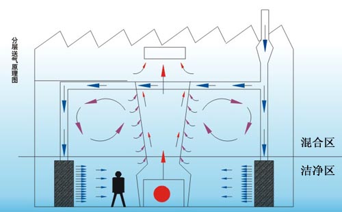 分層送風(fēng)技術(shù)是在廠房兩側(cè)約 3-4 米高采用低風(fēng)速大流量向廠房中部送新風(fēng)。在送風(fēng)氣流推力、煙塵上升和回風(fēng)口的吸力共同作用下,形成向上流動的氣流。
