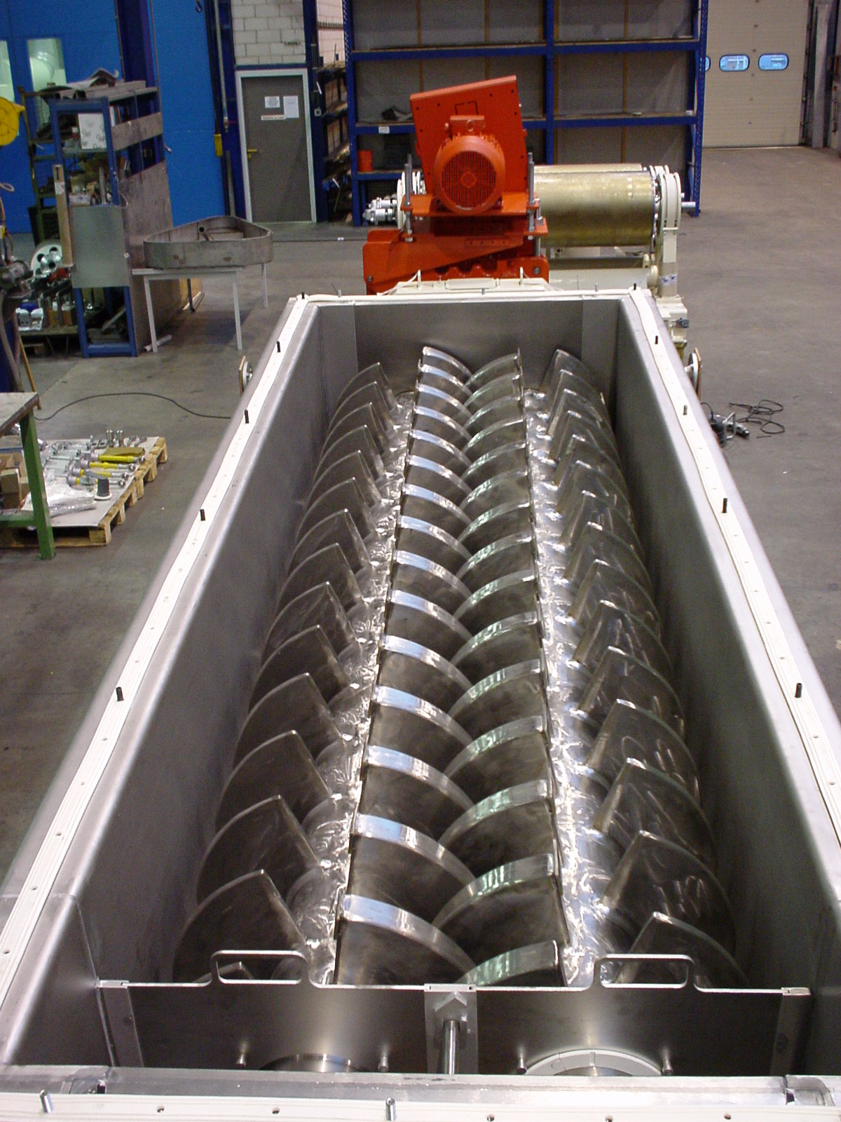 槳葉干燥機(jī)是一種在設(shè)備內(nèi)部設(shè)置空心攪拌槳,并在槳葉內(nèi)通熱載體,使污泥與槳葉的熱表面充分接觸,將污泥干燥的一種低速攪拌干燥器,結(jié)構(gòu)形式一般為臥式,雙軸或四軸。