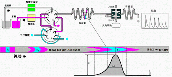 載流液經(jīng)陶瓷泵輸送至反應(yīng)管道中,當(dāng)六通閥將水樣和顯色劑切入反應(yīng)管道中后,樣品和試劑被載流液推進(jìn)并在推進(jìn)過程中漸漸擴(kuò)散,呈現(xiàn)梯度混合,梯度混合區(qū)帶快速發(fā)生顯色反應(yīng),流過流通池,由光電比色計測量并記錄液流中反應(yīng)的酒紅色絡(luò)合物對530nm波長光吸收后透過光強(qiáng)度的變化值,獲得有相應(yīng)峰高和峰寬的響應(yīng)曲線,用峰高或峰寬,經(jīng)比較計算求得水樣中鎳離子的值。儀器每天自動做一次標(biāo)定。