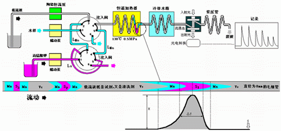 載流液(10%硫酸)經(jīng)泵加壓,以0.5Pa壓力輸送至反應管道中,當六通閥將水樣和高錳酸鉀切入反應管道中后,樣品和試劑被載流液推進并在推進過程中漸漸擴散,呈現(xiàn)梯度混合,梯度混合區(qū)帶在高溫高壓條件下快速發(fā)生氧化反應,流過流通池,由光電比色計測量并記錄液流中剩余的紫色高錳酸鉀對530nm波長光吸收后透過光強度的變化值,獲得有相應峰高和峰寬的響應曲線,用峰高或峰寬,經(jīng)比較計算求得水樣中高錳酸鹽指數(shù)的值。儀器每天自動做一次標定。