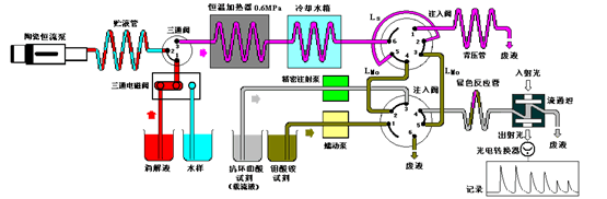 儀器的陶瓷恒流泵間隔吸入過硫酸鉀氧化消解液和水樣在貯液管中,再將其推入加熱的反應(yīng)毛細(xì)管中擴(kuò)散,形成消解液和水樣混合,在高溫高壓下,水樣中的各種磷化合物經(jīng)過過硫酸鉀氧化消解轉(zhuǎn)變成正磷酸根離子(PO43-)。用鉬酸銨、酒石酸銻氧鉀和被抗壞血酸作載流液,消解后的水樣被注入閥定量切入載流液中,進(jìn)入顯色反應(yīng)管,在強(qiáng)酸性條件下,正磷酸根離子與鉬酸銨、酒石酸銻氧鉀反應(yīng)生成磷鉬雜多酸,再被抗壞血酸還原后生成藍(lán)色配合物流經(jīng)比色計(jì)的流通池內(nèi),測量其光電壓變化值,通過其峰高或峰寬,可求得樣品中的TP含量。儀器每天自動做一次標(biāo)定。