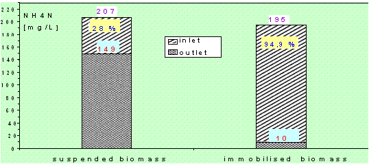 通過(guò)對(duì)比試驗(yàn)可以很清楚地看到當(dāng)使用LEVAPOR® 懸浮填料時(shí)抑制劑對(duì)硝化的負(fù)面影響將大大降低。從下圖可以看出,在COD為1600mg/l,鹽度為20-25 g/L并且總氮負(fù)荷Lv為0.25gN/Lxd的相同條件下,使用LEVAPOR® 懸浮填料其硝化率達(dá)到94.9%,而使用活性污泥法硝化率只能達(dá)到28%。