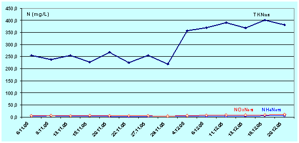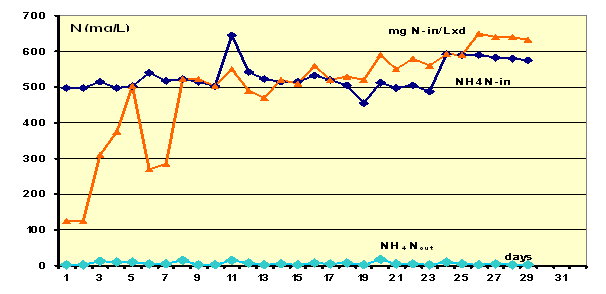 該工程屬于改建項(xiàng)目,原設(shè)施設(shè)計(jì)的目的是去除COD,現(xiàn)在增加了硝化和反硝化處理,通過(guò)計(jì)算如果總氮負(fù)荷Lv >0.6 kgN/m3xd,硝化過(guò)程穩(wěn)定。采用傳統(tǒng)的活性污泥法和類(lèi)似工藝,如要到達(dá)穩(wěn)定的硝化F:M比至少為70g N/kg MLSS xd,相應(yīng)的總氮負(fù)荷Lv 為0.3-0.35 kgN/m3xd,明顯比設(shè)計(jì)值要小。如果采用以LEVAPOR® 懸浮填料為載體的流化床工藝,則完全滿足上述設(shè)定的參數(shù)。處理結(jié)果如下圖所示,工程達(dá)到預(yù)期的目的。