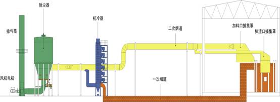 廢銅精煉反射爐冶煉分為:加料期、熔化期、氧化期、還原期和出銅期等五個過程,煙氣主要產(chǎn)生于加料、氧化和還原期,其中氧化期煙氣溫度最高,含塵濃度最大。