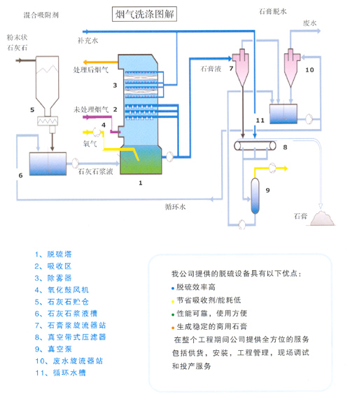 我公司的煙氣洗滌工藝是世界性的煙氣脫硫標準工藝。它利用石灰石或石灰作為吸收劑,石膏是脫硫過程的副產(chǎn)品。