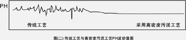 采用高密度污泥工藝后,沉淀后污泥的平均粒徑可以由1μm提高到5μm以上,沉淀池底流污泥濃度可達到15%(含固率),經(jīng)脫水機脫水后污泥的含固率可由25%提高至40%以上,污泥總體積可以減少60-65%。采用高密度污泥工藝后,廢水處理系統(tǒng)的穩(wěn)定性得到了顯著的提高,圖(二)為采用兩種工藝PH值波動曲線。