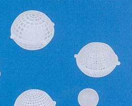 它是用塑料注造二個(gè)半圓的魚(yú)網(wǎng)狀的環(huán)形。中心放置塑料編織絲或小塊海綿。在污水的生化處理中具有全立體結(jié)構(gòu),比表面積大,直接投放,無(wú)須固定,易掛膜、不堵塞。全塑結(jié)構(gòu)單元填料具有A/O、A2/O水解—好氧化功能,剩余污泥極少,使用壽命長(zhǎng)。 注:φ100球每立方1000只 φ80球每立方2000只。