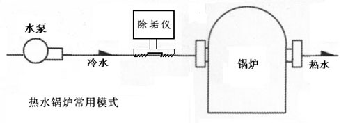 將Decent_tech 非接觸電子感應(yīng)水處理系統(tǒng)安裝在鍋爐進(jìn)水管道處。鍋爐應(yīng)用模式示意圖如下:
