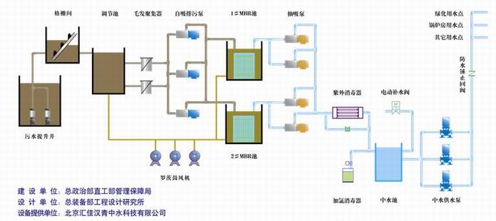黃寺中水站位于解放軍總政治部黃寺大院東院,隸屬于總政治部直工部管理保障局,建筑面積共356平方米,其中地上一層31平方米,地下一層108平方米,地下二層217平方米。采用目前國際上先進的膜-生物反應器(Membrane Bioreactor,MBR)中水處理工藝,處理規(guī)模為500m3/d。