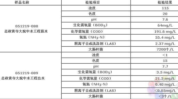 中水站原水為黃寺大院內的生活污水,污水從各化糞池溢流出后經(jīng)過排水管道匯流到中水站外的集水池,由潛污泵提升至中水站,進入中水處理系統(tǒng)。機械格柵去除污水中較大的懸浮、漂浮物;調節(jié)池收集污水,調節(jié)水質、水量;毛發(fā)聚集器進一步去除格柵難以去除的毛發(fā)等長纖維狀物,然后自吸排污泵提升調節(jié)池污水進入MBR池。污水由中水處理系統(tǒng)的核心單元——膜-生物反應器處理后,再經(jīng)過紫外消毒器和加氯消毒器兩級消毒,出水水質優(yōu)于國家現(xiàn)行標準《城市污水再生利用 城市雜用水水質》(GB/T18920-2002)。中水由供水系統(tǒng)送到大院內的各個中水用水點:綠地的微噴灌溉管網(wǎng),人工湖補水口,鍋爐房補水口,洗車房,道路灑水車取水口等。