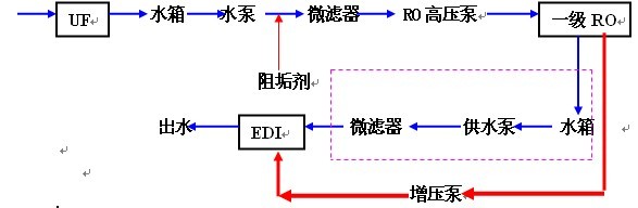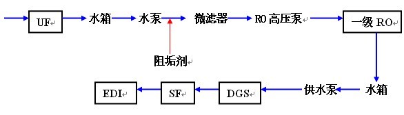 EDI在一定的原水進(jìn)水條件下,采用一級(jí)反滲透技術(shù)完全可以滿足EDI的運(yùn)行,重點(diǎn)推薦系統(tǒng)工藝: 超濾+一級(jí)反滲透+膜脫氣+EDI