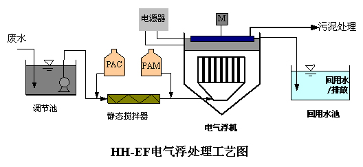 在直流電解作用下,氧離子在陽極失去電子生成氧氣,氫離子在陰極獲得電子生成氫氣,這種初生態(tài)的氫、氧氣比重輕、粒徑均勻、附著力強(qiáng)等特點(diǎn),當(dāng)其與被處理廢水中的懸浮物或油滴接觸時(shí),使絮凝物的視比重比水輕,使水中污染物質(zhì)結(jié)構(gòu)發(fā)生氧化還原反應(yīng),達(dá)到去除脫色的目的。并在上浮力的作用下,使絮凝物上浮至凈化水表面形成穩(wěn)定的浮渣層,通過機(jī)械或人工刮去浮渣,使污水得到凈化。