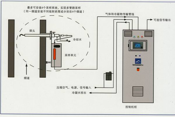 經(jīng)過吸附后,氣泵將待測氣體通過一個柔性管線采集到控制柜,在控制柜中氣體被冷卻下來(<5℃),從而完全祛除冷凝物。依據(jù)煙氣流速,溫度和壓力,通過一個熱式質(zhì)量流量計和變頻控制采樣泵對抽取采樣進(jìn)行連續(xù)的等速采樣控制。