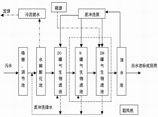 該技術(shù)采用生物膜法,第一級采用無需曝氣的折板厭氧水解池(ABR),內(nèi)部設(shè)置折板,在厭氧條件下能夠?qū)⑽樟。第二級采用曝氣生物濾池(BAF),內(nèi)部填加φ6~φ10mm的無機固體填料,采用微量曝氣供氧,內(nèi)部的填料既提高了氧的利用率,同時也起到過濾的作用。兩級生物膜法都是高效、低能耗技術(shù)。