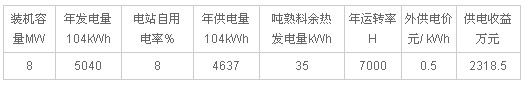 在窯頭窯尾增設(shè)ESSE熱管型余熱鍋爐,窯頭煙氣溫度從300℃降到100℃,窯尾煙氣溫度由330℃降到220℃,排出的廢氣用于生料烘干,以上兩部分熱量回收折發(fā)電量為8000Kw。