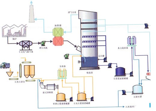 主要包括:煙氣系統(tǒng);循環(huán)水、工藝水系統(tǒng);脫硫劑制備系統(tǒng);副產(chǎn)品回收系統(tǒng);控制系統(tǒng)等。詳見工藝流程圖。