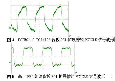 EPI總線優(yōu)化了背板的PCI和 ISA信號走線, 與之前的PICMG 1.0 PCI/ISA配套背板相比,背板上總線PCI信號到PCI擴展槽走線大大縮短,從而減少了信號線上的分布電容,使得PCI和ISA信號質量得到明顯改善,保證了系統的可靠性。其信號質量對比如圖4,圖5所示,其信號質量和穩(wěn)定性都大大提高。