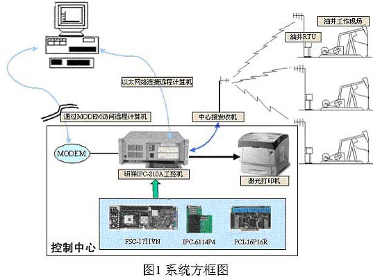 監(jiān)測中心收發(fā)信機從空中接收到由油井遙控遙測主機的信號后,通過對射頻信號放大、解調(diào),恢復(fù)成數(shù)傳信號送中心工業(yè)控制計算機處理計算,實時監(jiān)測油井工況。當(dāng)有異常時,中心工業(yè)控制計算機立即向油井遙控遙測主機發(fā)出控制命令,控制電機停機待修。這樣可以實現(xiàn)整個系統(tǒng)的自動化運行,無人職守進行整個系統(tǒng)的監(jiān)控。
