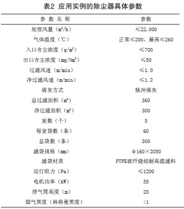 應用實例:某垃圾焚燒爐袋式除塵器應用PTFE玻纖燒結(jié)耐高溫濾料制成的濾袋配套。其除塵器具體參數(shù)如表2。