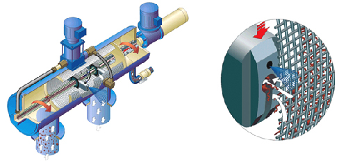 在清洗狀態(tài)下,過濾器的排放室始終打開,直接與大氣相通,并通過持續(xù)排污閥和超級排污閥不斷排出小流量的水,這股水流都是經(jīng)由各吸嘴出來的,這些吸嘴直接與一個中空的吸吮掃描器相通,并經(jīng)由渦輪室再到排污閥排出。