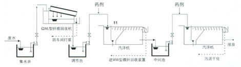 將廢水中的主要污染物長、短纖維和經(jīng)富銘2號環(huán)保藥劑絮凝的微纖,通過LQ型纖維回收微濾機及 LW型微纖回收裝置分別進行回收后,課直接返回車間打漿再造紙。80%左右的處理水可返回車間回用,20%水經(jīng)深度處理后達標排放(冬季可實現(xiàn)零排放)。
