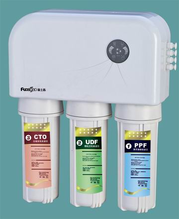 第一級(jí):PP棉(孔徑為5微米的PPF濾芯):對(duì)原水初步過(guò)濾,去除水中較粗顆粒雜質(zhì)、膠體、懸浮物等。