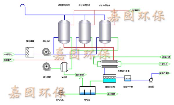 該工藝分為三個(gè)過程:廢氣吸附、蒸汽脫附、熱風(fēng)烘干。經(jīng)過預(yù)處理后的有機(jī)廢氣進(jìn)入吸附凈化床中,吸附床中的活性炭將廢氣中的有機(jī)成分吸附在內(nèi)部微孔結(jié)構(gòu)中,凈化后的潔凈氣體通過煙囪達(dá)標(biāo)排放。每套裝置設(shè)置二至四臺吸附床,正常運(yùn)行中一臺吸附床處于脫附再生階段或備用階段,其他吸附床處于吸附階段,通過不同吸附床的切換使用使凈化系統(tǒng)連續(xù)運(yùn)行,不影響車間正常生產(chǎn)。