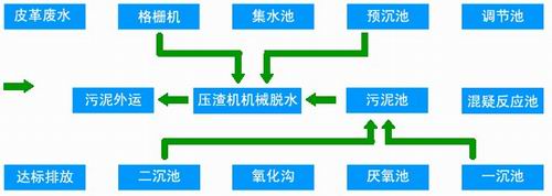 本工藝生化段采用前級厭氧工藝水解酸化預處理,后級再進入氧化溝深度處理的模式,主處理段為氧化溝法,厭氧處理段采用復合填料的推流式操作工藝,工藝成熟,處理效果穩(wěn)定,操作簡便,利用率高。氧化溝流出的泥水混合液在二沉池中得到充分的分離,最終達標排放。每天產(chǎn)生的剩余污泥排放到污泥池,需排渣的污泥再經(jīng)污泥濃縮池初步濃縮后用污泥泵打到壓濾機進行污泥脫水,污水回流調(diào)節(jié)池,干泥外運處理。