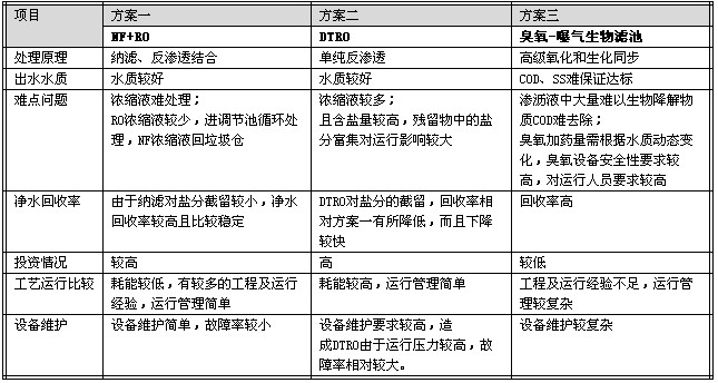 滲瀝液處理中,深度處理是難點(diǎn)和重點(diǎn),也是保證達(dá)標(biāo)及運(yùn)行管理的關(guān)鍵步驟,關(guān)于深度處理方案,做常見三種方案的比選,見表1