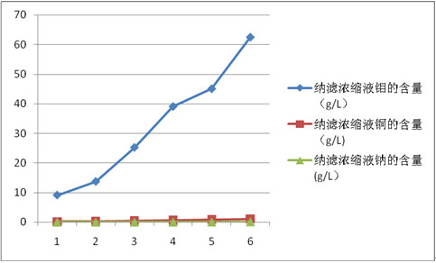 鉬的濃縮中,納濾的截留率穩(wěn)定在98%以上,重金屬離子如Cu的截留率也在98%以上,而納濾濃縮液鈉離子的積累量穩(wěn)定在回用料液安全指標(biāo)之下。