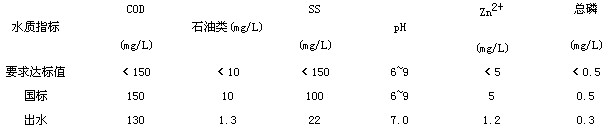 處理工藝為物理—化學(xué)方法,鱗化廢水經(jīng)破乳后,投加藥劑不使絮狀物下沉,而且去除了石油類和磷、鋅等污染物,降低了COD。最后采用高效固液分離器,進一步凈化水質(zhì)。高濃度磷化原液和脫脂原液則經(jīng)過預(yù)處理后定量進入主流程。出水經(jīng)調(diào)節(jié)pH后達標排放。
