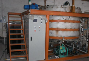 1)CMBR振動(dòng)膜分離及超聲波在線清洗系統(tǒng):廢油水經(jīng)雜物籃粗網(wǎng)予處理后進(jìn)入廢油水調(diào)節(jié)池,然后廢油水經(jīng)油泵打入振動(dòng)膜油污分離槽,經(jīng)真空機(jī)自吸及通過0.05UM微濾膜過濾后產(chǎn)出凈化油達(dá)到澄清透明排出,濾膜工作一段時(shí)間后,壓力由0.05Mpa升高到0.5Mpa時(shí),傳感器通過PLC微電腦反饋信號(hào),自動(dòng)啟動(dòng)超聲波進(jìn)行在線振動(dòng)定時(shí)清洗,保證膜的通量穩(wěn)定。