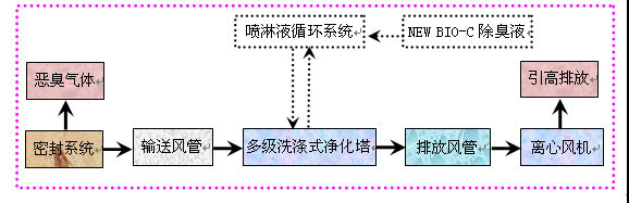 我們采用美國(guó)原裝進(jìn)口的New Bio-C除臭液(用自來(lái)水稀釋到一定的比例)為噴淋洗滌液。